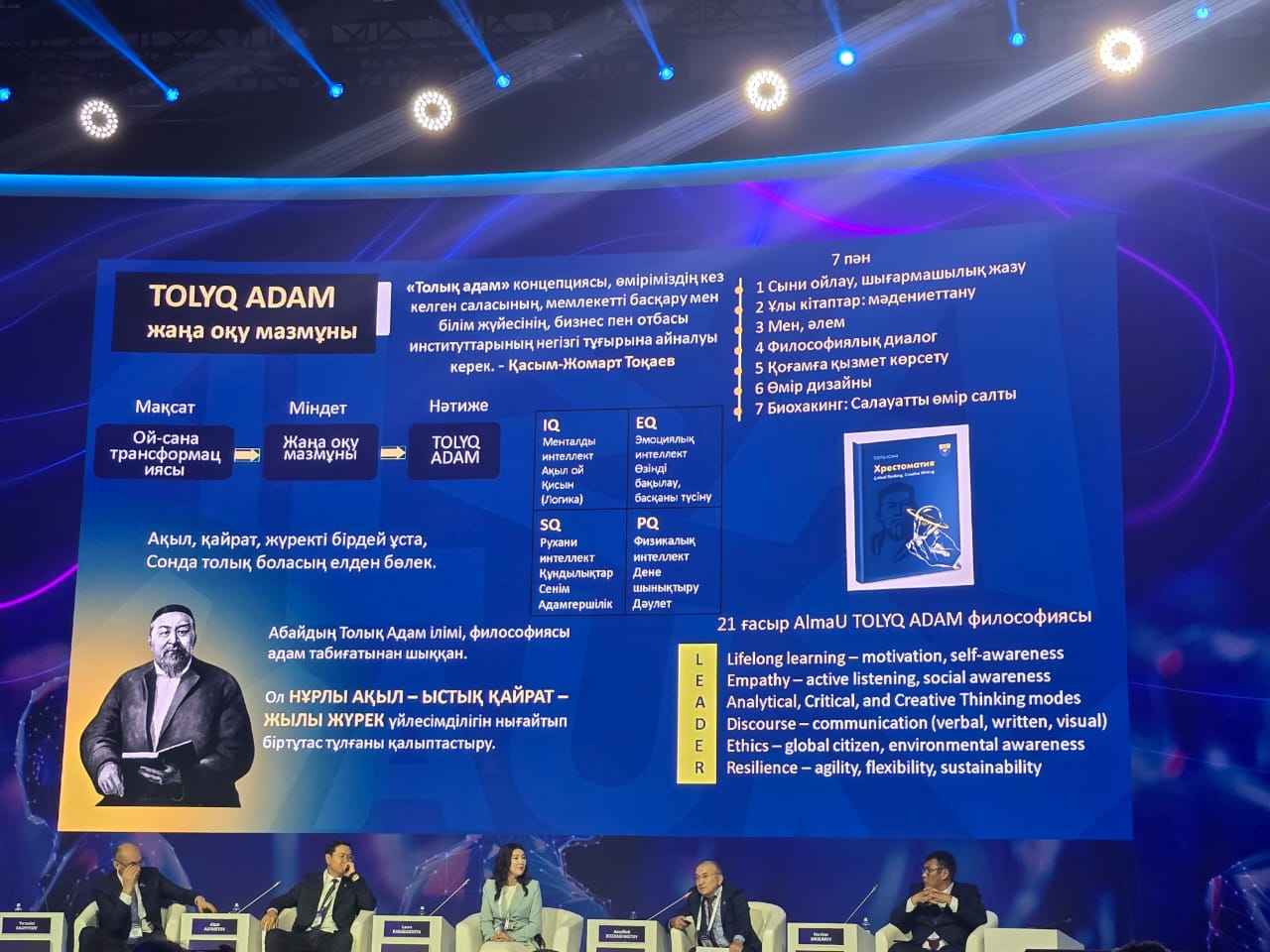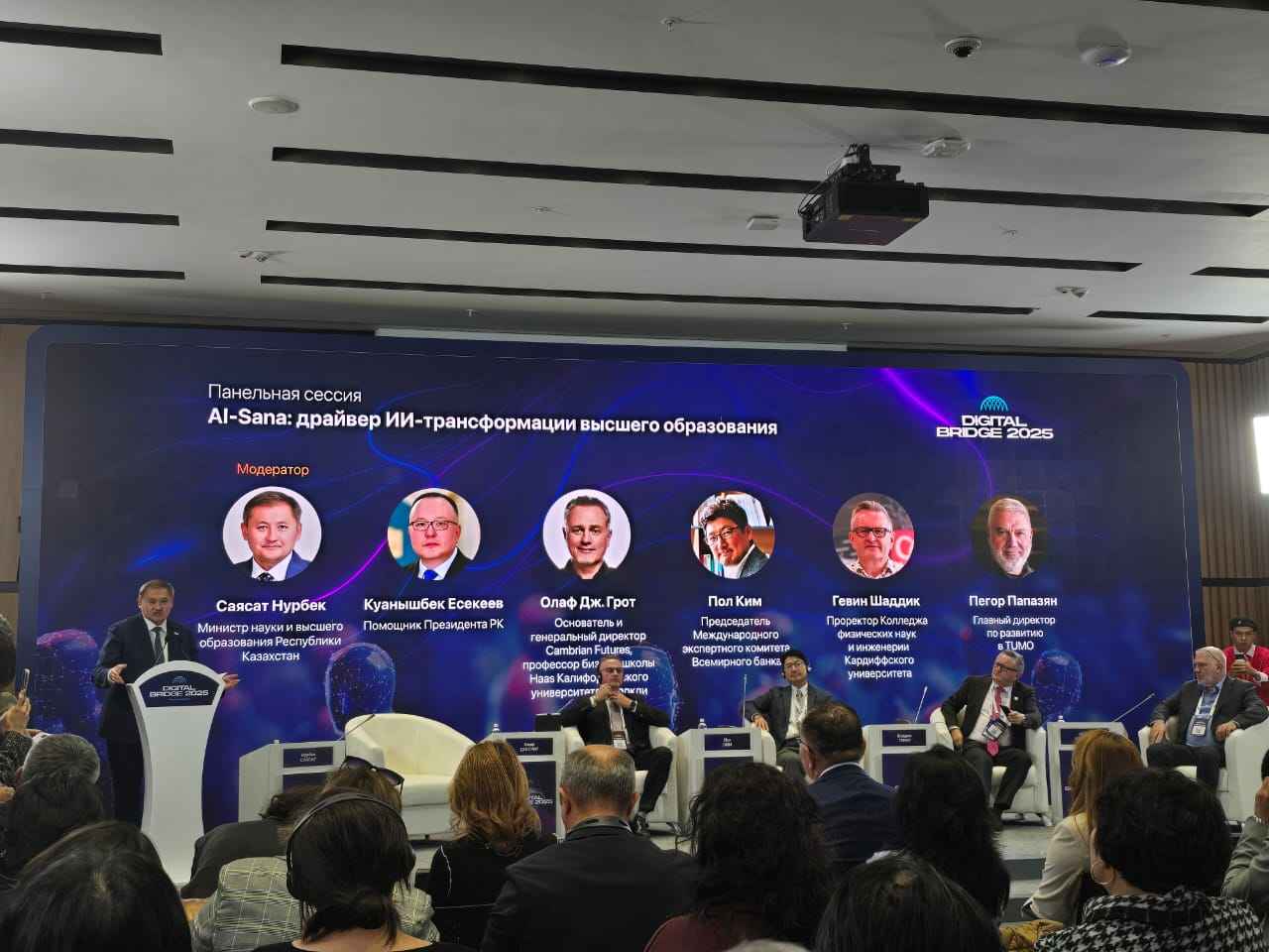 Ғылым және жоғары білім министрі Саясат Нұрбек өз сөзінде AI-Sana бағдарламасы еліміздің барлық университеттерін қамтитынын атап өтті: ЖИ барлық мамандықтар үшін міндетті пәнге айналды, 38 жаңа білім беру бағдарламасы ашылды, ал 440 мыңнан астам студент пен оқытушы базалық сертификаттар алды.